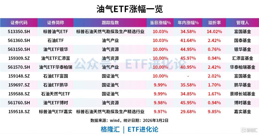 油气ETF领涨,标(biao)普油气ETF(513350)、石(shi)油ETF(561360)等涨停。