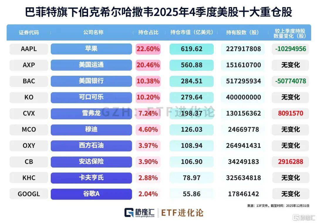 截至(zhi)2025岁终,伯克希尔持有的股票投资总公允代价中,约65%会合在五家公司:美国运通、苹果、美国银行、可口可乐(le)和雪佛(fo)龙。
